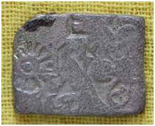 | Description / विवरण | The shape of the coin is pentagonal. Obverse Sun, six armed wheel, animal figure and some indistinct symbols. Reverse Some indistinct minute symbols. |