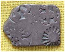 | Description / विवरण | The shape of the coin is irregular. Obverse Sun, frog, three arched mountain, six armed chakra. Reverse Two indistinct symbols. |