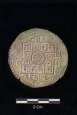 | Description / विवरण | Obverse Legend in square having the sun moon, star, Sri Sri Sri Surander Vir Vikram Sahadev date 1802 below ornamental trident inside a circle in the centre. Reverse Legend as on the cons of Sri Sri Sri Rajender Vir Vikram Sahadev around a dagger with wreath legend Sri Sri Sri Gorakhnath around the circle with each syllable on one petal. |