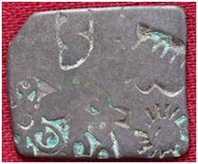 | Description / विवरण | The coin is an imperial type of Punch- marked coin. The shape of the coin is pentagonal. Obverse taurine, bull, Sun, two arched hill and an animal on its top, a six armed wheel. Reverse A crescent. |