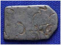| Description / विवरण | The coin is an imperial type of Punch-marked coin. The coin is hexagonal in shape. Obverse Animal, dot within a circle flanked by two taurines and other symbols are indistinct. Reverse Sun, taurine, and other symbols are not distinct. |