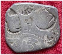 | Description / विवरण | The coin is an imperial type of Punch- marked coin. The shape of the coin is irregular. Obverse Sun, six armed wheel, two animals and three indistinct symbols. Reverse Sun, crescent topped three arched hill and some indistinct symbols. |