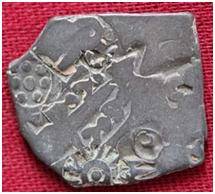 | Description / विवरण | The coin is an imperial type of Punch- marked coin. The shape of the coin is irregular. Obverse Sun, six armed wheel, human figure flanked by four taurines, three arched hill, animal, flower designed dots within a circle and two indistinct symbols. Reverse Tree, crescent topped three arched hill, two crescent and two indistinct symbols. |