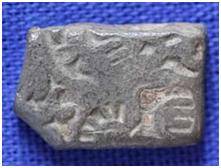 | Description / विवरण | The shape of the coin is roughly rectangular. One corner is chipped. Obverse Sun, six armed, animal and other symbols are indistinct. Reverse Symbols are minute. |
