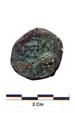 | Description / विवरण | Obverse- Head of a human with an elaborate headdress flowing behind. Reverse- Obliterated. |