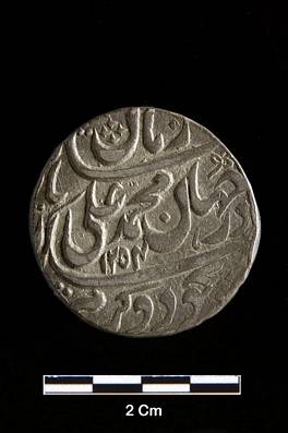 | Description / विवरण | Obverse Zaman Shah dar Jehan Muhammad Ali Bad, Sikka Zad bajudo Karam . 1254. Reverse Arms - In centre on fish surmounted by numeral 1 - supporters, two women bare headed, with hand supporting crown and standing on scroll, Inscription reading round arms Zarb Suba Awadh baitu-s-Saltanat Lacknow Sana Ahd Jalus Maimnat manus. |