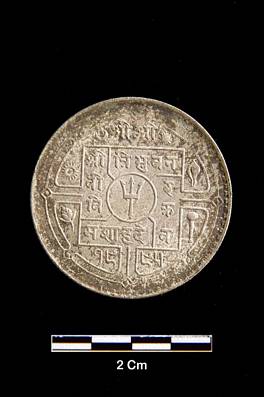 | Description / विवरण | Obverse Trident inside a central circle, Crescent, Star, Chakra , Sankh, Padma and Gada on respective side. Sri Sri Sri Tribhuwan Vir Vikram Shah Dev inside squire around circle. Date 1995 below in Saka era. Reverse Inside the central circle a Sword, Creeper. Sri Bhawani, Pachas paisa Nepal. Around the circle Sri Sri Sri Gorakhnath with one syllable each on the petals. |