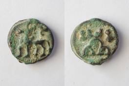 | Description / विवरण | On the obverse walking humped bull with swastika is depicted. On the reverse three arched hill is depicted. |