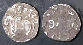 | Description / विवरण | Descrpn./Obv Recumbent bull facing left, wearing jhula (saddle cloth), with trisula (trident) symbol on rump. Above, legend in Sarada script Sri Samantadeva . Descrpn./Rev Rider with lance on caparisoned horse facing right. On left, Sarada letter bhi and on right, Sarada letter ta |