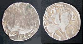 | Description / विवरण | Descrpn./Obv Recumbent bull facing left, wearing jhula (saddle cloth), with trisula (trident) symbol on rump. Above, legend in Sarada script Sri Samantadeva . Descrpn./Rev Rider with lance on caparisoned horse facing right. On left, Sarada letter bhi and on right, Sarada letter ta |