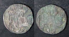 | Description / विवरण | Descrpn./Obv Recumbent bull facing left, wearing jhula (saddle cloth), with trisula (trident) symbol on rump. Above, legend in Sarada script Sri Samantadeva . Descrpn./Rev Rider with lance on caparisoned horse facing right. On left, Sarada letter bhi and on right, Sarada letter ta |