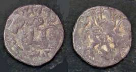 | Description / विवरण | Descrpn./Obv Recumbent bull facing left, wearing jhula (saddle cloth), with trisula (trident) symbol on rump. Above, legend in Sarada script Sri Samantadeva . Descrpn./Rev Rider with lance on caparisoned horse facing right. On left, Sarada letter bhi and on right, Sarada letter ta |