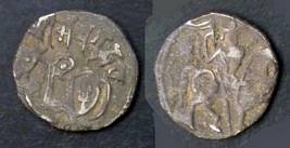 | Description / विवरण | Descrpn./Obv Recumbent bull facing left, wearing jhula (saddle cloth), with trisula (trident) symbol on rump. Above, legend in Sarada script Sri Samantadeva . Descrpn./Rev Rider with lance on caparisoned horse facing right. On left, Sarada letter bhi and on right, Sarada letter ta |