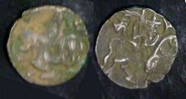 | Description / विवरण | Descrpn./Obv Recumbent bull facing left, wearing jhula (saddle cloth), with trisula (trident) symbol on rump. Above, legend in Sarada script Sri Samantadeva . Descrpn./Rev Rider with lance on caparisoned horse facing right. On left, Sarada letter bhi and on right, Sarada letter ta |