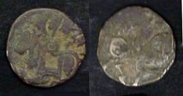 | Description / विवरण | Descrpn./Obv Recumbent bull facing left, wearing jhula (saddle cloth), with trisula (trident) symbol on rump. Above, legend in Sarada script Sri Samantadeva . Descrpn./Rev Rider with lance on caparisoned horse facing right. On left, Sarada letter bhi and on right, Sarada letter ta |
