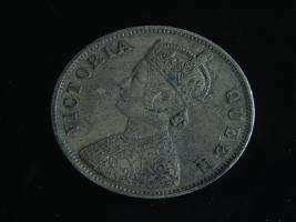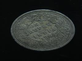 | Description / विवरण | The obverse shows the uncrowned head of the young Victoria facing left, hair done in a pony-tail, with the unbroken legend along the edge. Milled rim, with dotted circle. Obverse legend Victoria Queen. Reverse, in centre, surrounded by floral branches One Rupee yak rupiah in Persian characters . Along the edge, East India Company with the date 1840 at the bottom. Double circle with dots along the edge. |