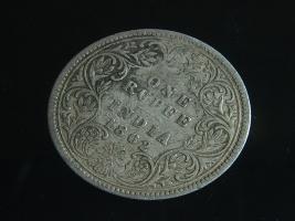 | Description / विवरण | The obverse shows the crowned bust of Victoria facing left, with the divided legend along the edge. Milled rim, with dotted circle. Obverse legend Victoria Queen. Reverse, in centre, surrounded by a floral vine One Rupee India 1862. Double circle with dots along the edge. |