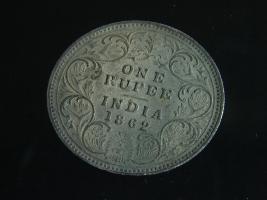 | Description / विवरण | The obverse shows the crowned bust of Victoria facing left, with the divided legend along the edge. Milled rim, with dotted circle. Obverse legend Victoria Queen. Reverse, in centre, surrounded by a floral vine One Rupee India 1862. Double circle with dots along the edge. |