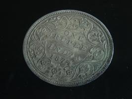 | Description / विवरण | The obverse shows the crowned bust of Victoria facing left, with the divided legend along the edge. Milled rim, with dotted circle. Obverse legend Victoria Queen. Reverse, in centre, surrounded by a floral vine One Rupee India 1862. Double circle with dots along the edge. |
