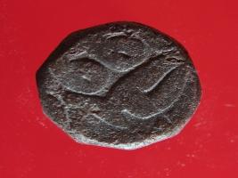 | Description / विवरण | Copper dam fulus of Akbar 962-1014 AH; 1556-1605 AD , from an unknown unidentifiable mint. Obverse, fragments of zarb fulus. Reverse, fragments of -99 nuhsad - . 999 AH . |