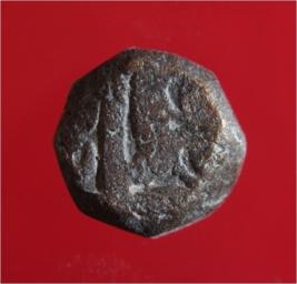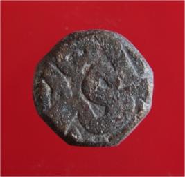 | Description / विवरण | Copper dam fulus of Akbar 962-1014 AH; 1556-1605 AD , from an unknown unidentifiable mint. Obverse Fragments of fulus and a quaterfoil Reverse - Fragments of Nuhsad |