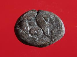 | Description / विवरण | Copper dam fulus of Akbar 962-1014 AH; 1556-1605 AD , from an unknown unidentifiable mint. Obverse, fragments of zarb fulus Reverse, fragments of sanh -00- . |