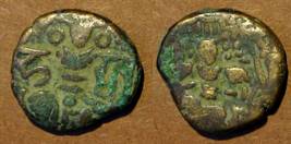 | Description / विवरण | Descrpn./Obv Stylised seated Goddess facing; Sharada legend, Ha (on l.) rsha ra (on r.). Descrpn./Rev Stylised standing king design; Sharada legend, jadeva (on r.) |