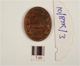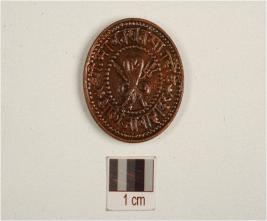 | Description / विवरण | A circular shape copper coin of madhav rao scindhia period, having two snake and one trident on one obverse, flower motif on reverse. |