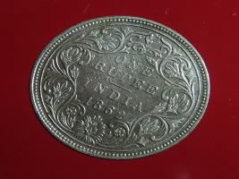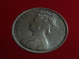 | Description / विवरण | The obverse shows the crowned bust of Victoria facing left, with the divided legend on either side along the edge. Milled rim, with dotted circle. Obverse legend Victoria Queen. Reverse, in centre, surrounded by floral border One rupee India 1862. Double circle with dots along the edge. |
