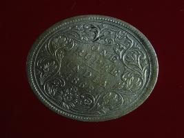 | Description / विवरण | The obverse shows the crowned bust of Victoria facing left, with the divided legend on either side along the edge. Milled rim, with dotted circle. Obverse legend Victoria Queen. Reverse, in centre, surrounded by floral border One rupee India 1862. Double circle with dots along the edge. |