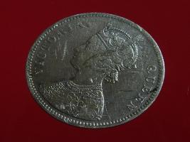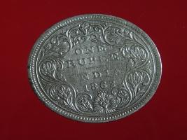 | Description / विवरण | The obverse shows the crowned bust of Victoria facing left, with the divided legend on either side along the edge. Milled rim, with dotted circle. Obverse legend Victoria Queen. Reverse, in centre, surrounded by floral border One rupee India 1862. Double circle with dots along the edge. |