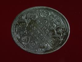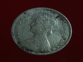 | Description / विवरण | The obverse shows the crowned bust of Victoria facing left, with the divided legend on either side along the edge. Milled rim, with dotted circle. Obverse legend Victoria Queen. Reverse, in centre, surrounded by floral border One rupee India 1877. Double circle with dots along the edge. |