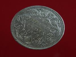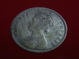 | Description / विवरण | The obverse shows the crowned bust of Victoria facing left, with the divided legend on either side along the edge. Milled rim, with dotted circle. Obverse legend Victoria Empress. Reverse, in centre, surrounded by floral border One rupee India 1878. Double circle with dots along the edge. |