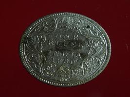 | Description / विवरण | The obverse shows the crowned bust of Victoria facing left, with the divided legend on either side along the edge. Milled rim, with dotted circle. Obverse legend Victoria Empress. Reverse, in centre, surrounded by floral border One rupee India 1880. Double circle with dots along the edge. |