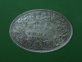 | Description / विवरण | The obverse shows the crowned bust of Victoria facing left, with the divided legend on either side along the edge. Milled rim, with dotted circle. Obverse legend Victoria Empress. Reverse, in centre, surrounded by floral border One rupee India 1900. Double circle with dots along the edge. |