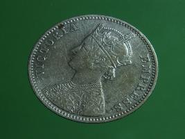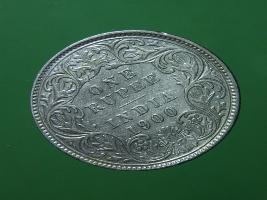 | Description / विवरण | The obverse shows the crowned bust of Victoria facing left, with the divided legend on either side along the edge. Milled rim, with dotted circle. Obverse legend Victoria Empress. Reverse, in centre, surrounded by floral border One rupee India 1900. Double circle with dots along the edge. |