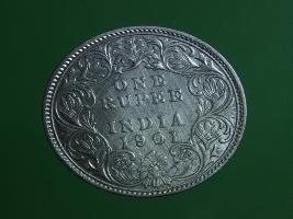 | Description / विवरण | The obverse shows the crowned bust of Victoria facing left, with the divided legend on either side along the edge. Milled rim, with dotted circle. Obverse legend Victoria Empress. Reverse, in centre, surrounded by floral border One rupee India 1901. Double circle with dots along the edge. |