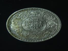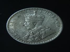 | Description / विवरण | The obverse shows the crowned head of George V facing left, with the continuous legend along the edge. Milled rim, with dotted circle. Beaded circle and milled rim. Obverse legend George V King Emperor. Reverse, in circle, surrounded by a floral vine One Rupee India 1916 yak rupiah in Persian characters . Double circle with beads along the edge. |