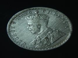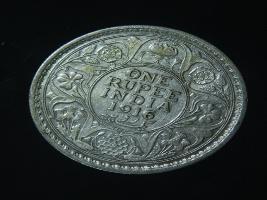 | Description / विवरण | The obverse shows the crowned head of George V facing left, with the continuous legend along the edge. Milled rim, with dotted circle. Beaded circle and milled rim. Obverse legend George V King Emperor. Reverse, in circle, surrounded by a floral vine One Rupee India 1916 yak rupiah in Persian characters . Double circle with beads along the edge. |