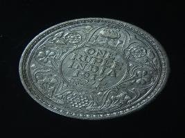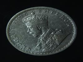 | Description / विवरण | The obverse shows the crowned head of George V facing left, with the continuous legend along the edge. Milled rim, with dotted circle. Beaded circle and milled rim. Obverse legend George V King Emperor. Reverse, in circle, surrounded by a floral vine One Rupee India 1916 yak rupiah in Persian characters . Double circle with beads along the edge. |