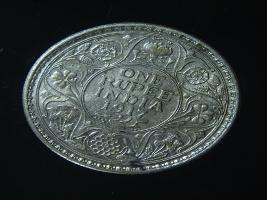 | Description / विवरण | The obverse shows the crowned head of George V facing left, with the continuous legend along the edge. Milled rim, with dotted circle. Beaded circle and milled rim. Obverse legend George V King Emperor. Reverse, in circle, surrounded by a floral vine One Rupee India 1916 yak rupiah in Persian characters . Double circle with beads along the edge. |