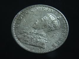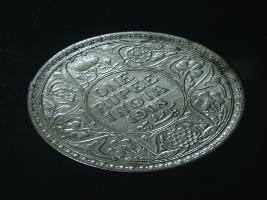 | Description / विवरण | The obverse shows the crowned head of George V facing left, with the continuous legend along the edge. Milled rim, with dotted circle. Beaded circle and milled rim. Obverse legend George V King Emperor. Reverse, in circle, surrounded by a floral vine One Rupee India 1918 yak rupiah in Persian characters . Double circle with beads along the edge. |