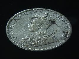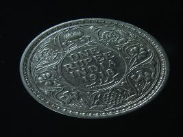 | Description / विवरण | The obverse shows the crowned head of George V facing left, with the continuous legend along the edge. Milled rim, with dotted circle. Beaded circle and milled rim. Obverse legend George V King Emperor. Reverse, in circle, surrounded by a floral vine One Rupee India 1918 yak rupiah in Persian characters . Double circle with beads along the edge. |