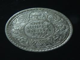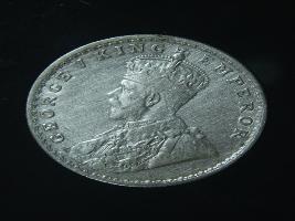 | Description / विवरण | The obverse shows the crowned head of George V facing left, with the continuous legend along the edge. Milled rim, with dotted circle. Beaded circle and milled rim. Obverse legend George V King Emperor. Reverse, in circle, surrounded by a floral vine One Rupee India 1918 yak rupiah in Persian characters . Double circle with beads along the edge. |
