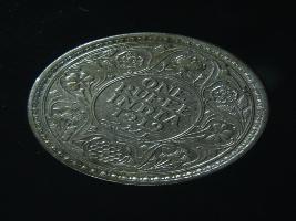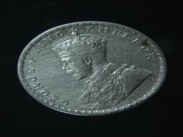 | Description / विवरण | The obverse shows the crowned head of George V facing left, with the continuous legend along the edge. Milled rim, with dotted circle. Beaded circle and milled rim. Obverse legend George V King Emperor. Reverse, in circle, surrounded by a floral vine One Rupee India 1919 yak rupiah in Persian characters . Double circle with beads along the edge. |