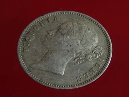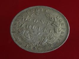 | Description / विवरण | The obverse shows the uncrowned head of the young Victoria facing left, hair done in a pony-tail, with the unbroken legend along the edge. Milled rim, with dotted circle. Obverse legend Victoria Queen. Reverse, in centre, surrounded by floral branches One Rupee yak rupiah in Persian characters . Along the edge, East India Company with the date 1840 at the bottom. Double circle with dots along the edge. |