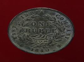 | Description / विवरण | The obverse shows the uncrowned head of the young Victoria with her hair done in a pony-tail. The legend in this coin is divided . Milled rim, with dotted circle. Obverse legend Victoria Queen. At the truncation, the raised initials WW , very small, barely visible. Reverse, in centre One rupee yak rupiah in Persian characters . Surrounded with crossed leafy branches wreath, with berries, tied with a ribbon. At bottom, the date 1840 , & the words East India Company along the edge. |