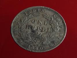 | Description / विवरण | The obverse shows the uncrowned head of the young Victoria with her hair done in a pony-tail. The legend in this coin is divided . Milled rim, with dotted circle. Obverse legend Victoria Queen. At the truncation, the raised initials WW , very small, barely visible. Reverse, in centre One rupee yak rupiah in Persian characters . Surrounded with crossed leafy branches wreath, with berries, tied with a ribbon. At bottom, the date 1840 , & the words East India Company along the edge. |
