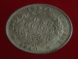 | Description / विवरण | The obverse shows the uncrowned head of the young Victoria with her hair done in a pony-tail. The legend in this coin is divided . Milled rim, with dotted circle. Obverse legend Victoria Queen. At the truncation, the raised initials WW , very small, barely visible. Reverse, in centre One rupee yak rupiah in Persian characters . Surrounded with crossed leafy branches wreath, with berries, tied with a ribbon. At bottom, the date 1840 , & the words East India Company along the edge. |