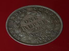 | Description / विवरण | The obverse shows the uncrowned head of the young Victoria with her hair done in a pony-tail. The legend in this coin is divided . Milled rim, with dotted circle. Obverse legend Victoria Queen. At the truncation, the raised initials WW , very small, barely visible. Reverse, in centre One rupee yak rupiah in Persian characters . Surrounded with crossed leafy branches wreath, with berries, tied with a ribbon. At bottom, the date 1840 , & the words East India Company along the edge. |